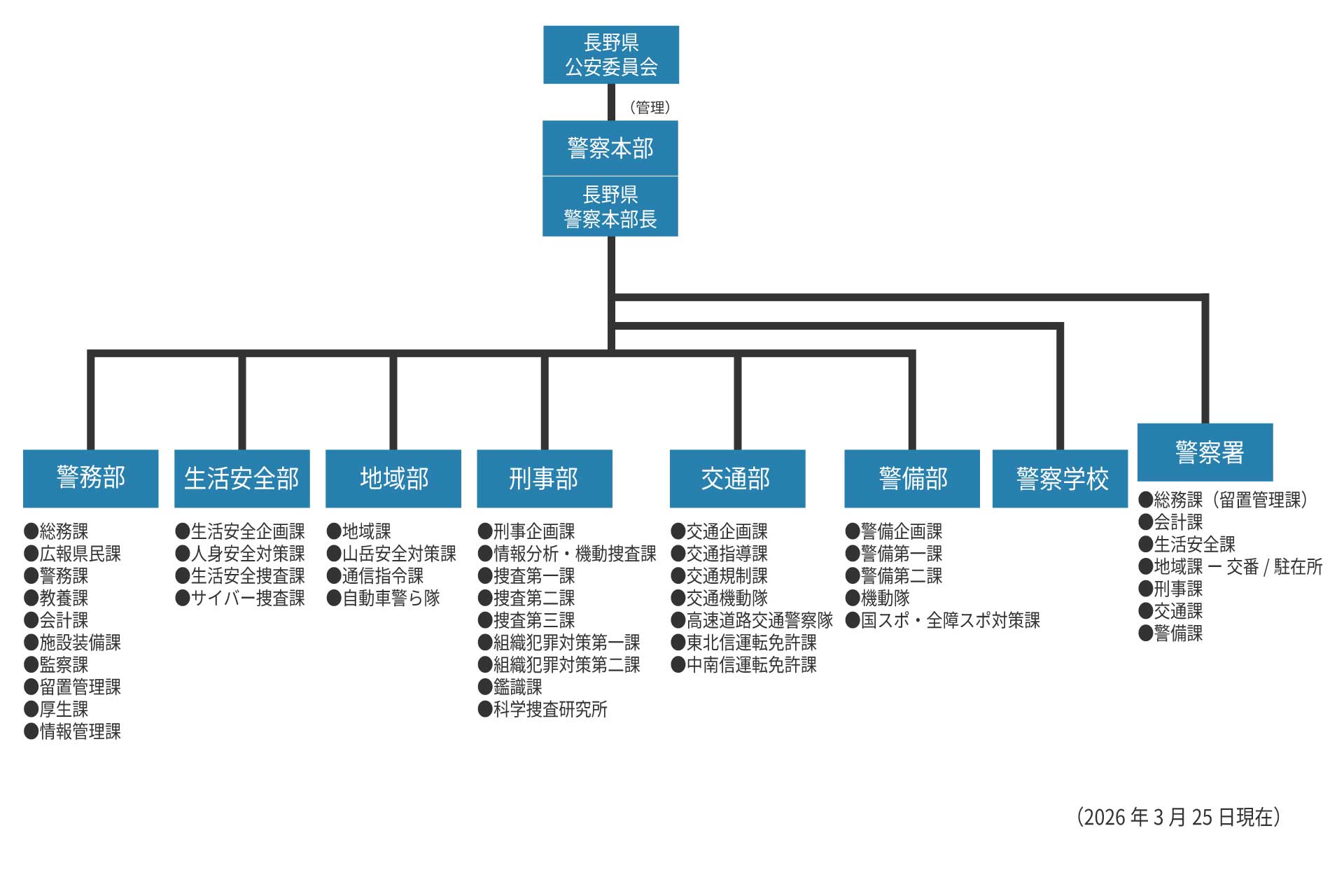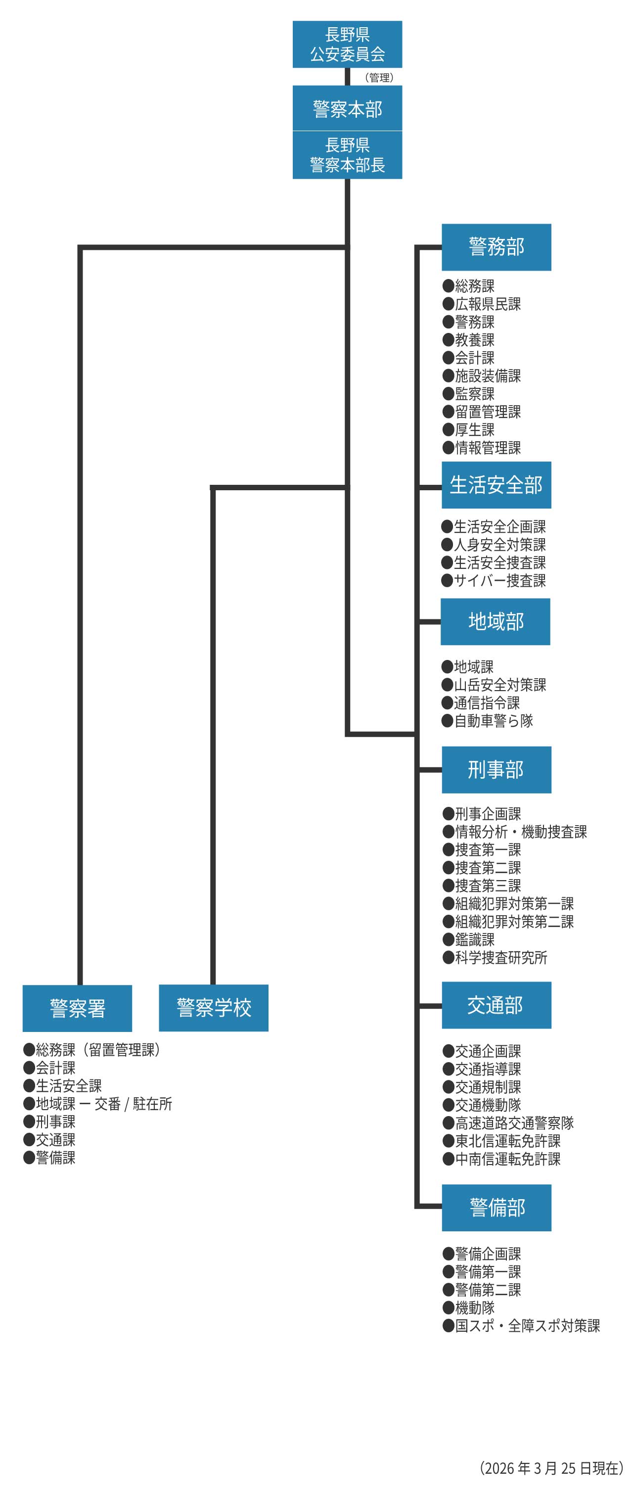 - 権堂町交番/柳町交番/⻑野駅前交番/若⾥交番/若松町交番/三輪交番/吉⽥交番/和⽥交番/安茂⾥交番/若槻⼤通り交番/東北交番/⼤⾖島交番/豊野町交番/飯綱町交番/信濃町交番/信州新町交番